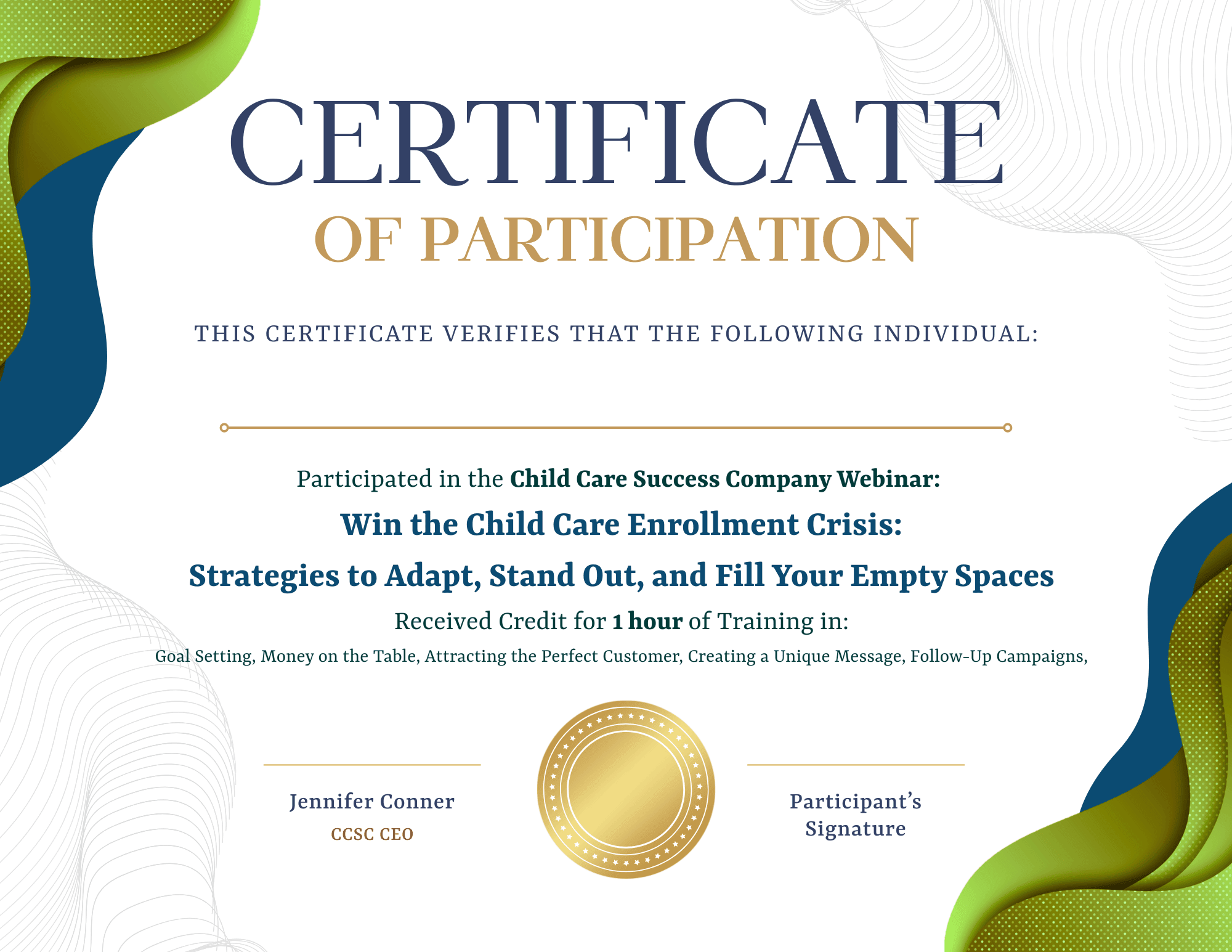 Thank you for taking the time to explore this opportunity—I’m confident that Enrollment Boot Camp LIVE will be a game-changer, giving you the exact tools, strategies, and expert coaching you need to create the thriving, fully booked child care center you’ve dreamed of!